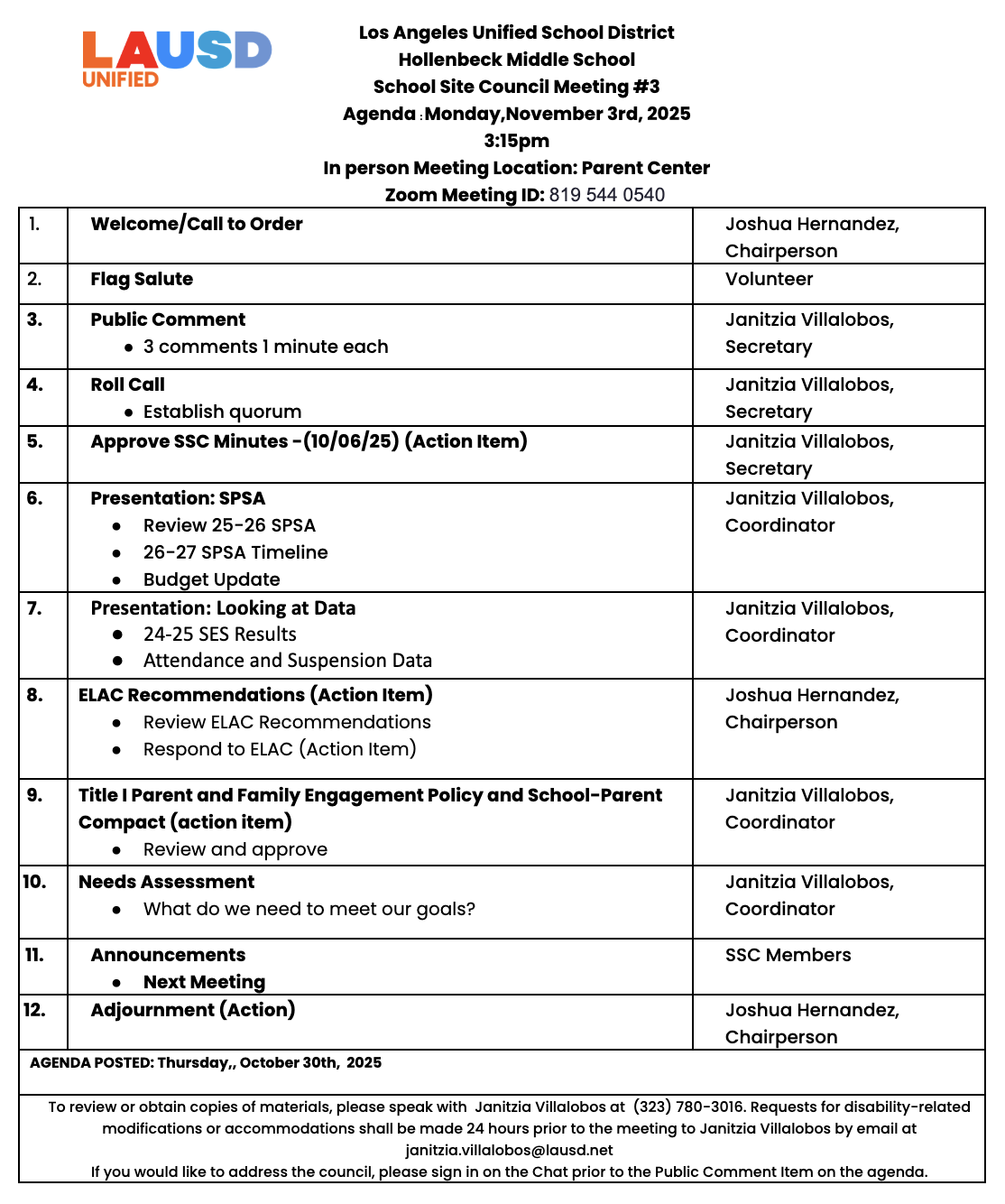 Review 25-26 SPSA26-27 SPSA TimelineBudget Update | Janitzia Villalobos, Coordinator |