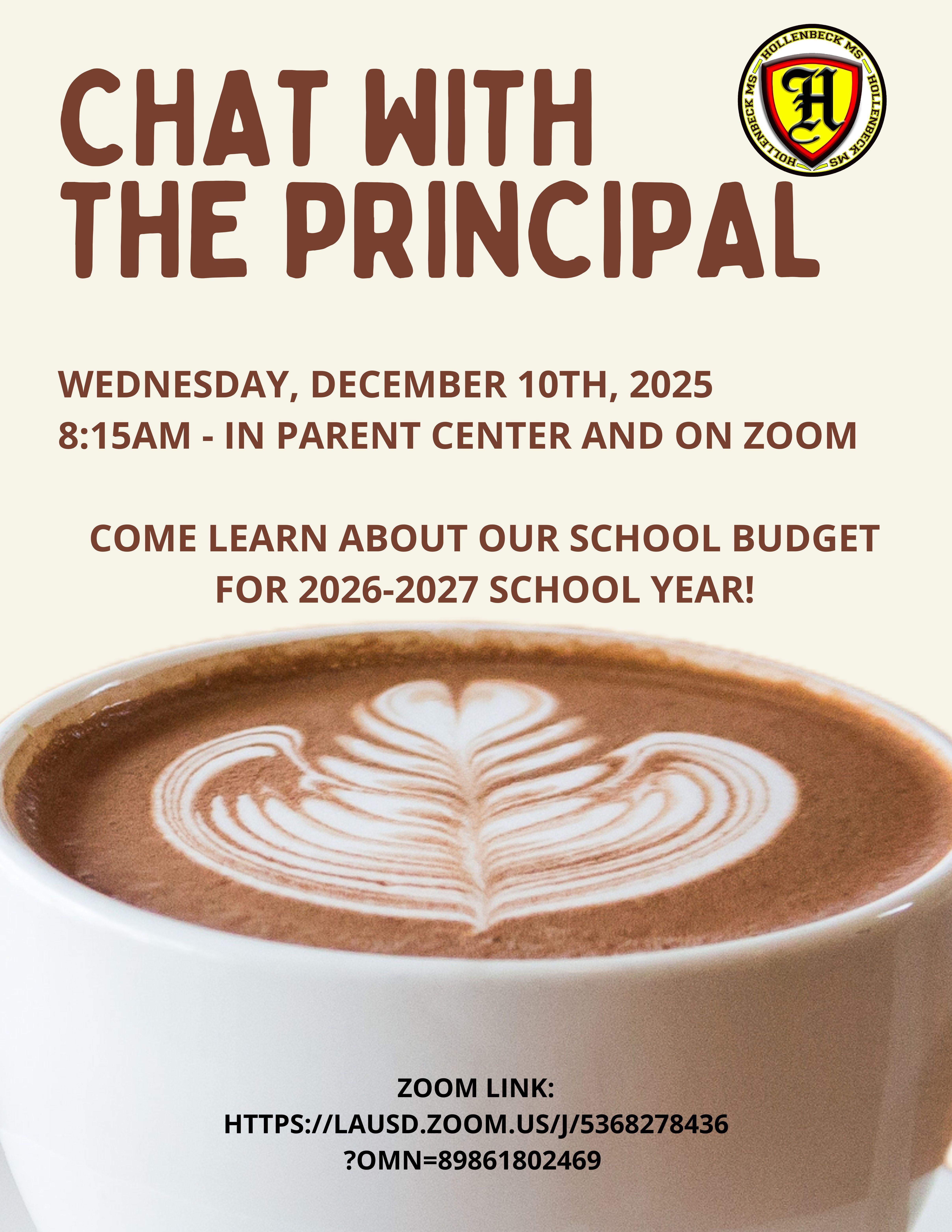 CHAT WITH THE PRINCIPAL CLICK ON LINK FOR ZOOM MEETING: https://lausd.zoom.us/j/5368278436?omn=89861802469